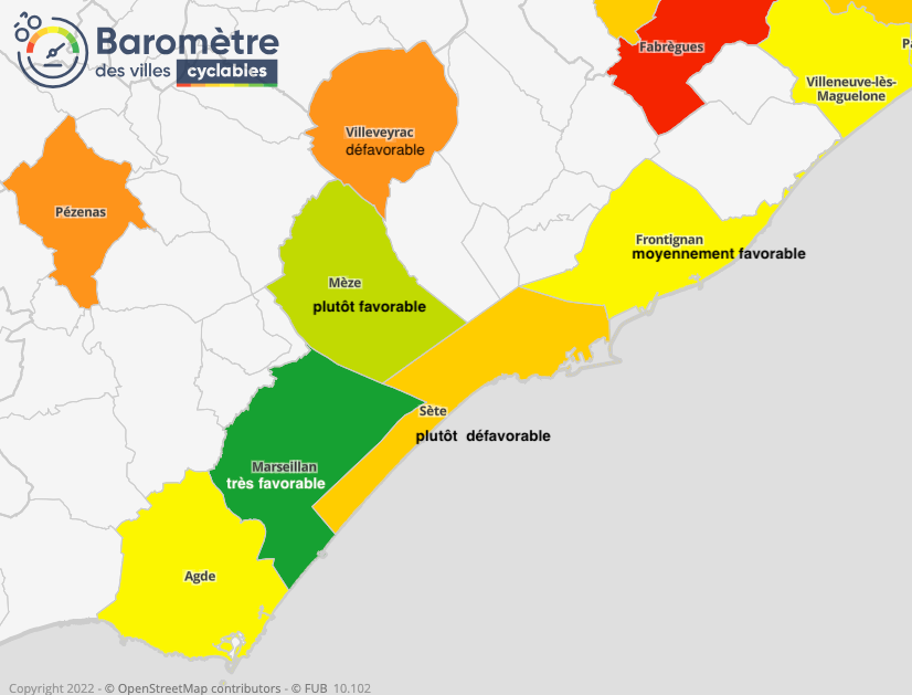 Pour les autres communes, le climat vélo reste défavorable, « plutôt défavorable » pour Sète, Montbazin, Poussan et Villeveyrac, voire carrément « défavorable » pour Gigean.