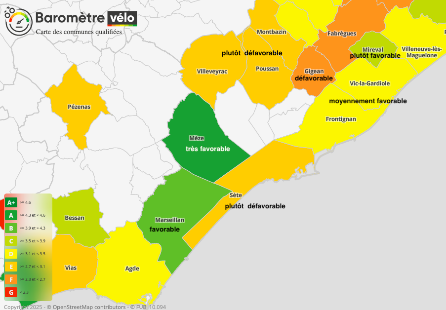 Pour toutes les autres communes, les résultats de 2025 sont décevants : le climat vélo de Marseillan est jugé « favorable » et régresse par rapport à 2021, celui de Mireval « plutôt favorable », Frontignan et Vic-la-Gardiole ont un climat « moyennement favorable » sans changement par rapport à 2021.