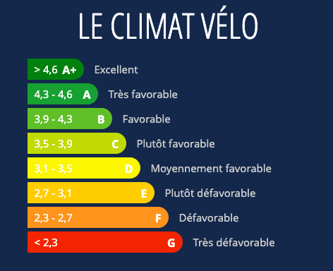 La climat vélo est mesuré à partir de plusieurs critères : le ressenti global des cyclistes, la sécurité, le confort des aménagements, les efforts de la ville en faveur du vélo, les services et le stationnement.