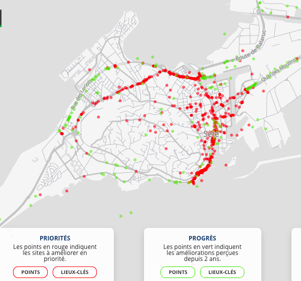 Autre constat, l’analyse de la cartographie qui permet de cibler les points noirs ou les améliorations. Les résultats sur Sète montrent que l’analyse faite de la Roue libre de Thau est entièrement corroborée : points noirs au Théâtre de le Mer, accès au quai des Moulins, axe Verdun – Blanc, coeur de ville….